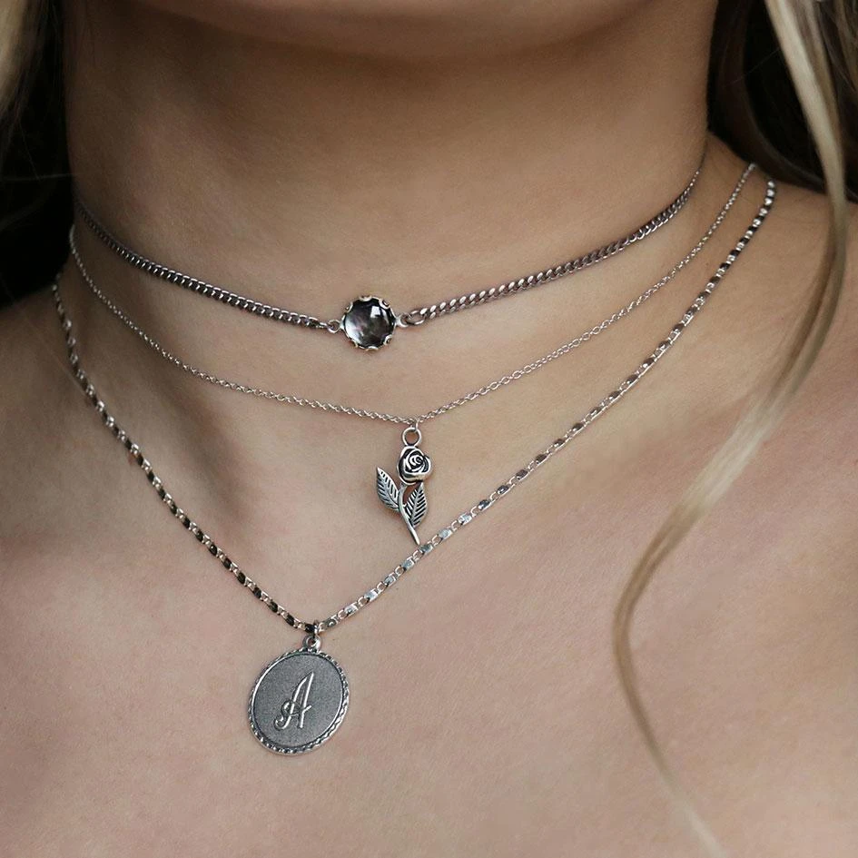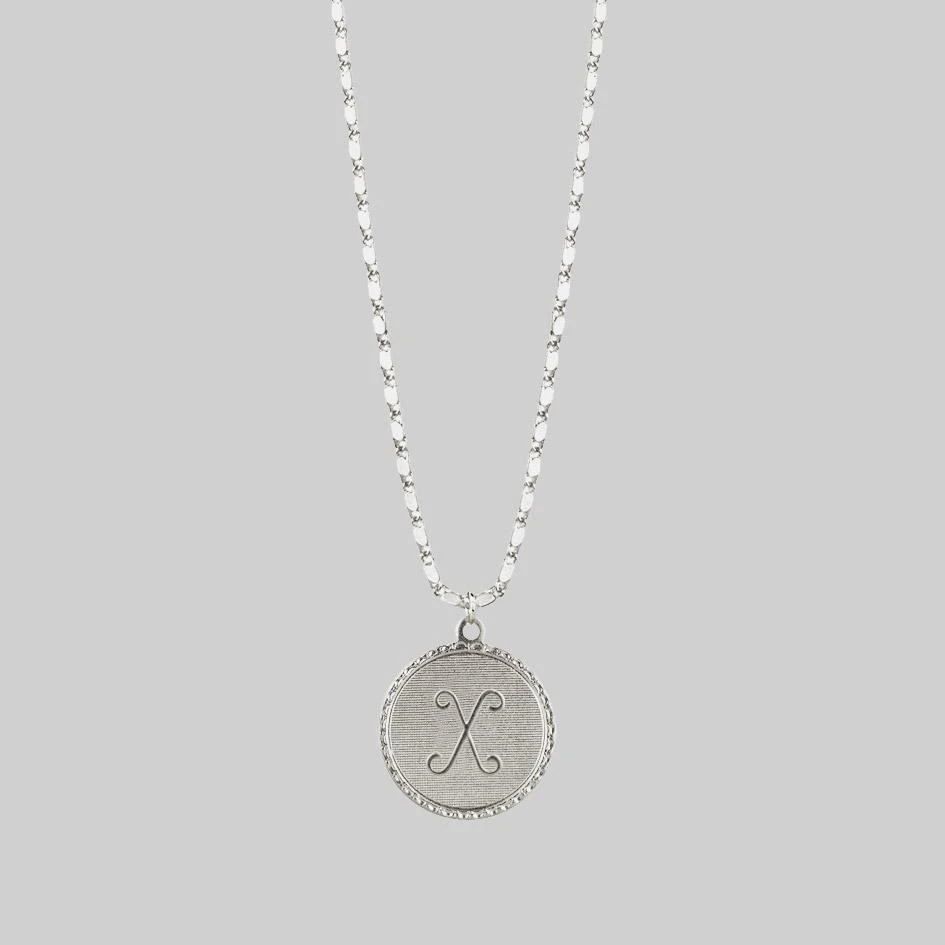 Silver medallion necklace featuring a delicate script initial and sparkling chain.