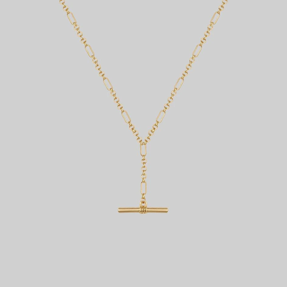 The ultimate layering T-Bar necklace featuring fancy Figaro chain with Belcher links.
