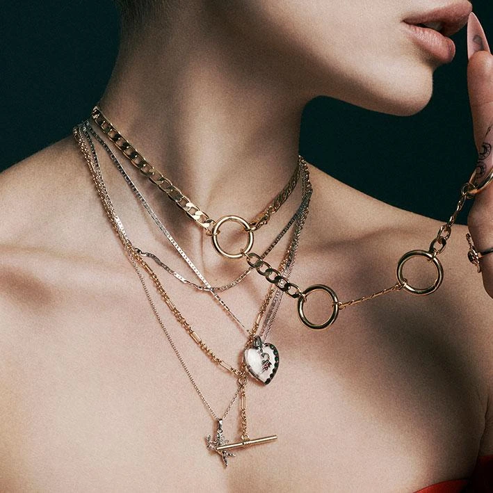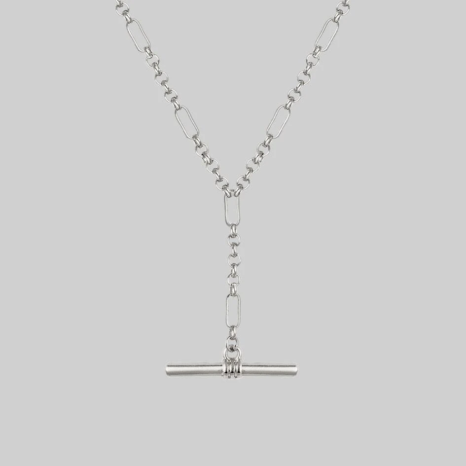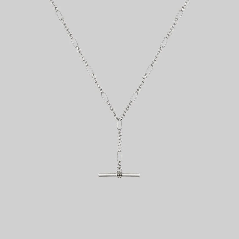 The ultimate layering T-Bar necklace featuring fancy Figaro chain with Belcher links.