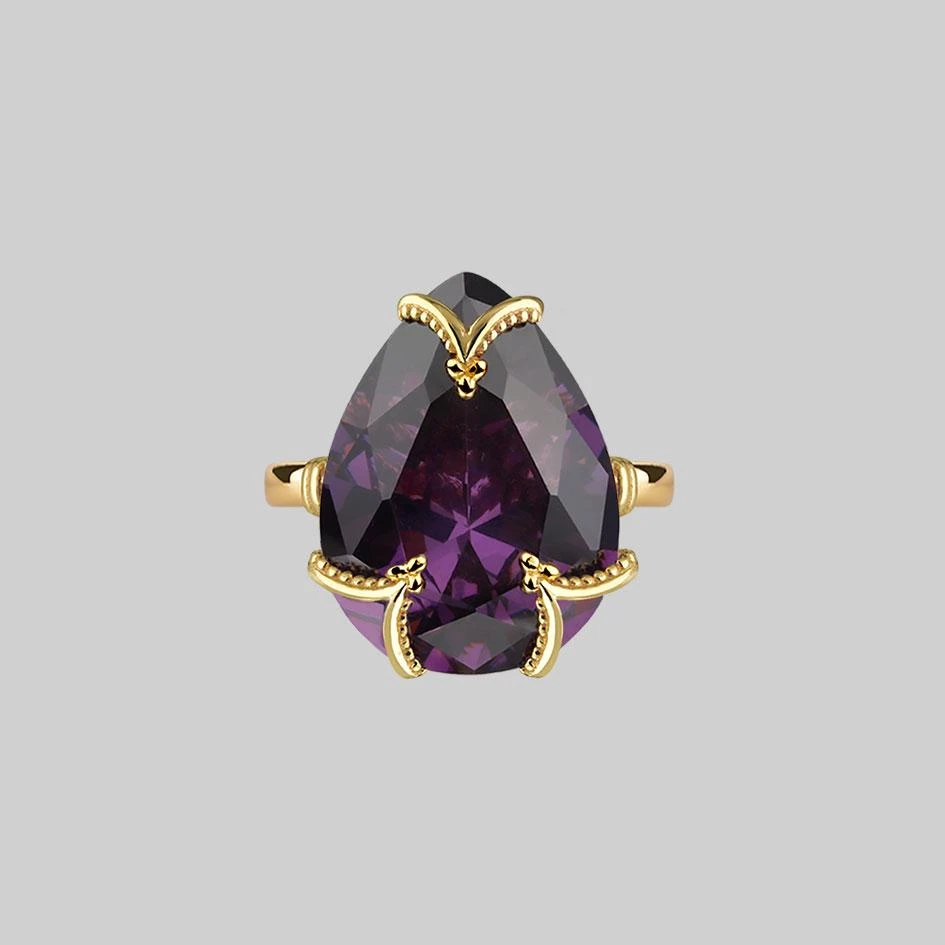 Fierce statement ring featuring a huge teardrop Amethyst CZ set within Gothic accents.