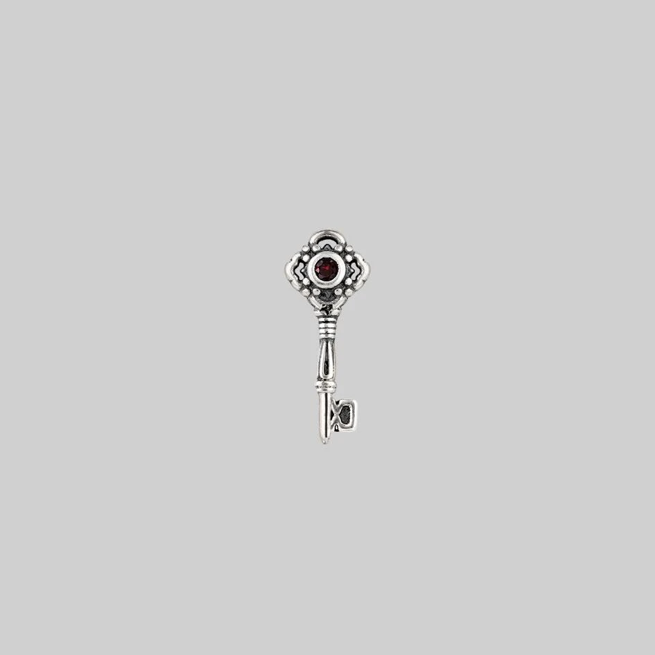 Intricate key cartilage stud earring, featuring a tiny Garnet gemstone.