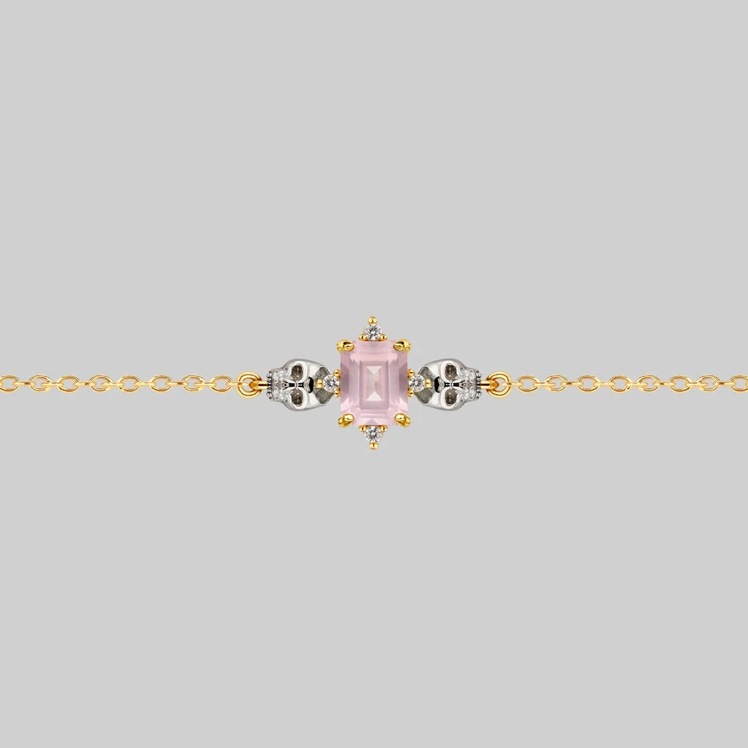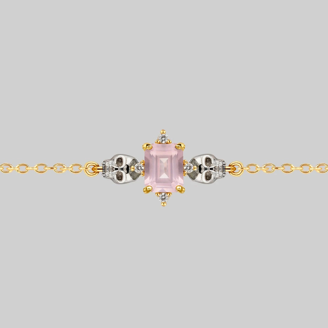 Deadly romantic little Skulls choker featuring a Cubic Zirconia encrusted Rose Quartz center.